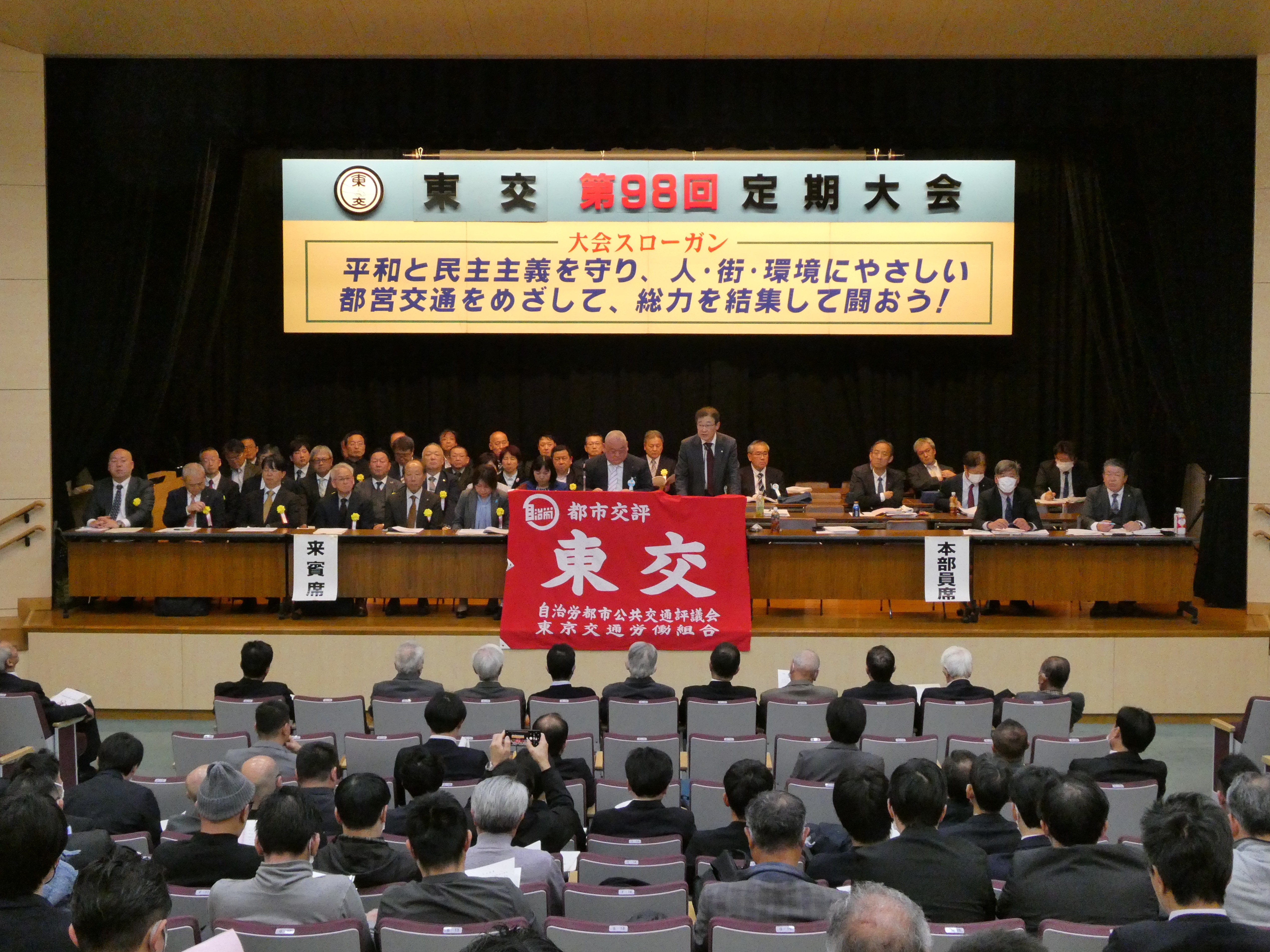 東交第98回定期大会 東交は3月12日、田町交通ビル6階ホールで「第98回定期大会」を開催した。代議員・来賓等含めて総勢250人が出席し、「①賃金闘争の取り組み。②労働条件改善。③欠員補充・要員確保」等を柱とする「2026年度運動方針」を決定した。