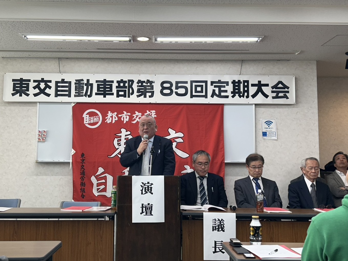 東交自動車部は3月21日、東交本部5階大会議室で「第85回定期大会」を開催した。 代議員等約90名が出席し、「①予備率改正・要員確保。②賃金改善。③労働条件改善」等を柱とする「2026年度運動方針」を決定した。