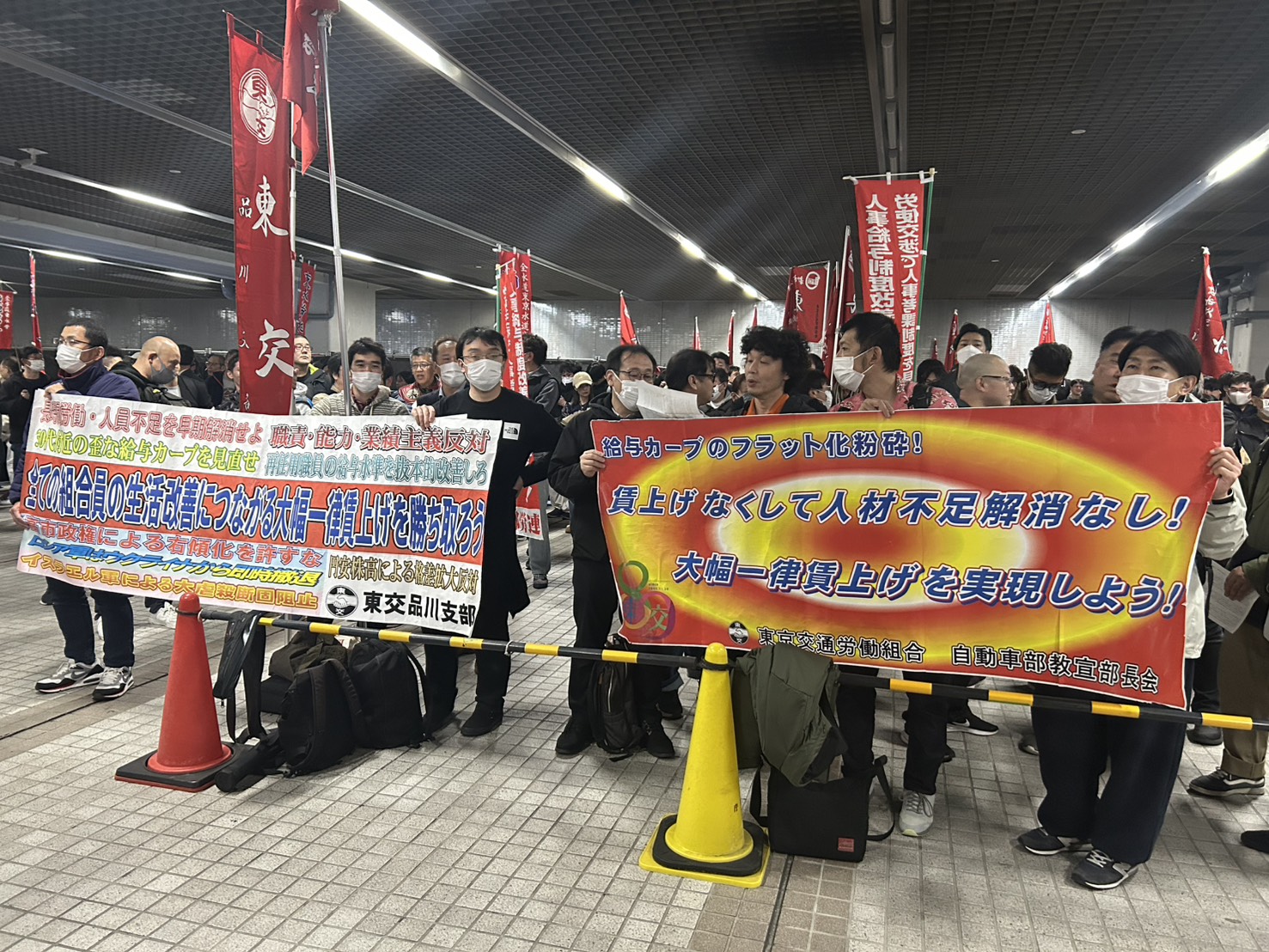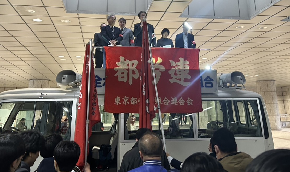 11月11日の回答指定日、都労連は午後3時30分より「第4波総決起集会」を開催し、東交からは1118名が結集した。集会では都労連全6単組の委員長・役員が決意表明を行い、翌11月12日の統一1時間ストライキを背景に、都側の不当な交渉姿勢を糾弾し、都労連要求の実現に向け全力をあげて闘い抜く集会決議を採択した。