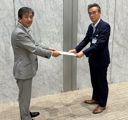 久我交通局長(右)に要求書を手交する福田執行委員長