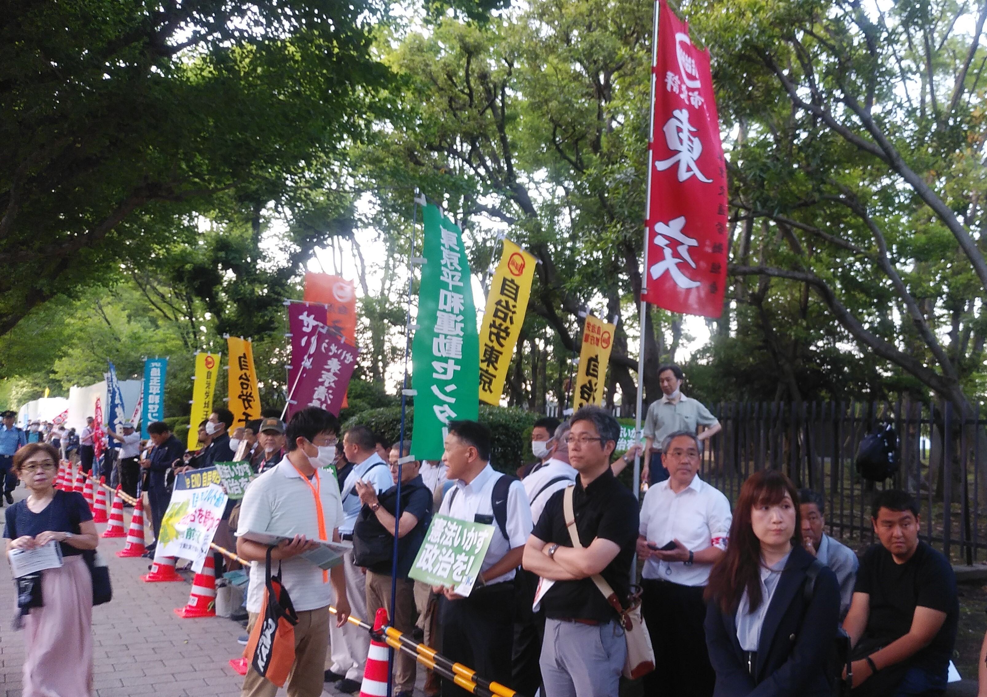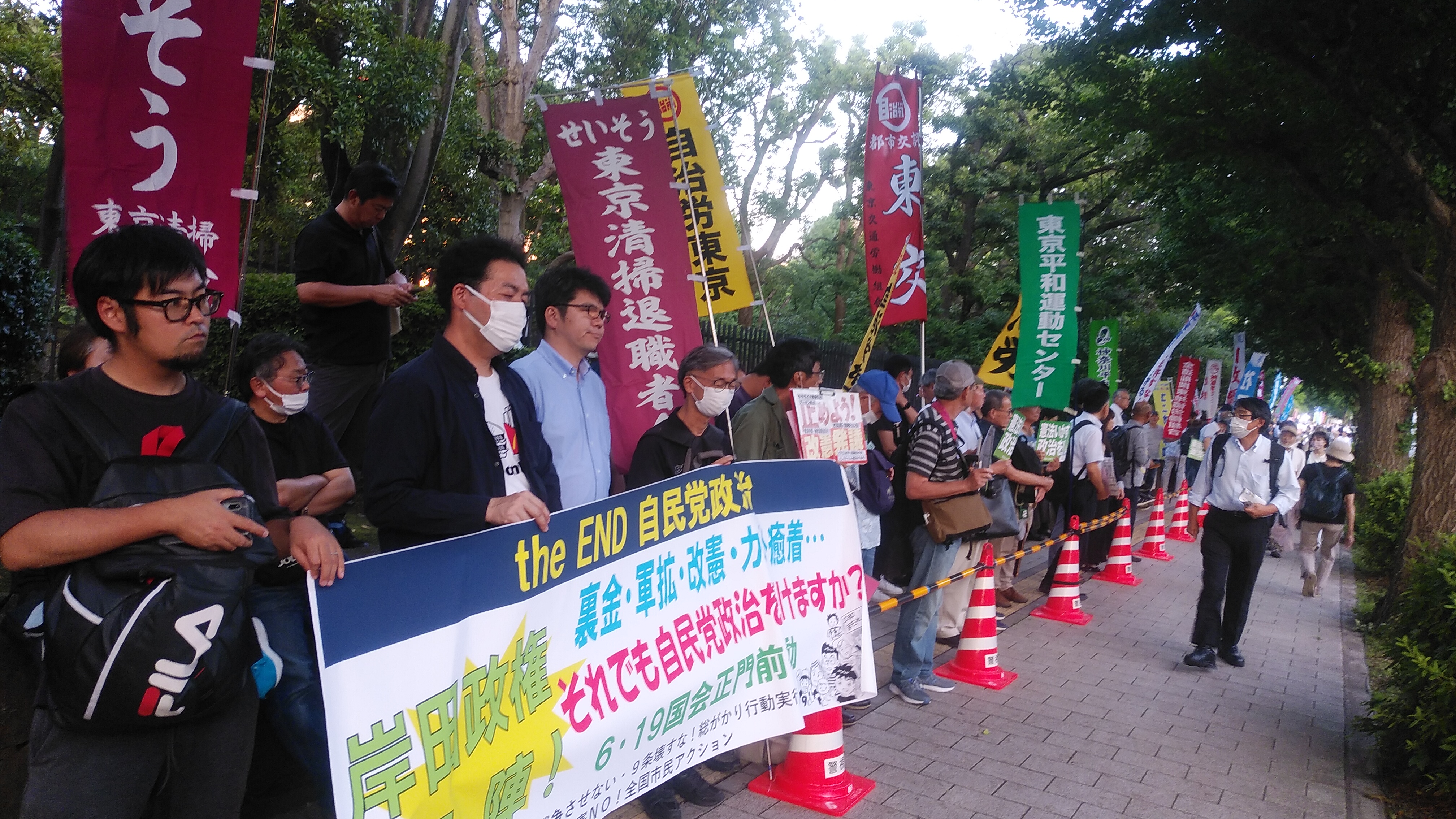 6月19日、国会議事堂正門前で「theEND自民党政治 裏金・軍拡・改憲・カルト癒着…それでも自民党政治を続けますか?6.19国会正門前行動」が開催され、東交より10名が参加した。