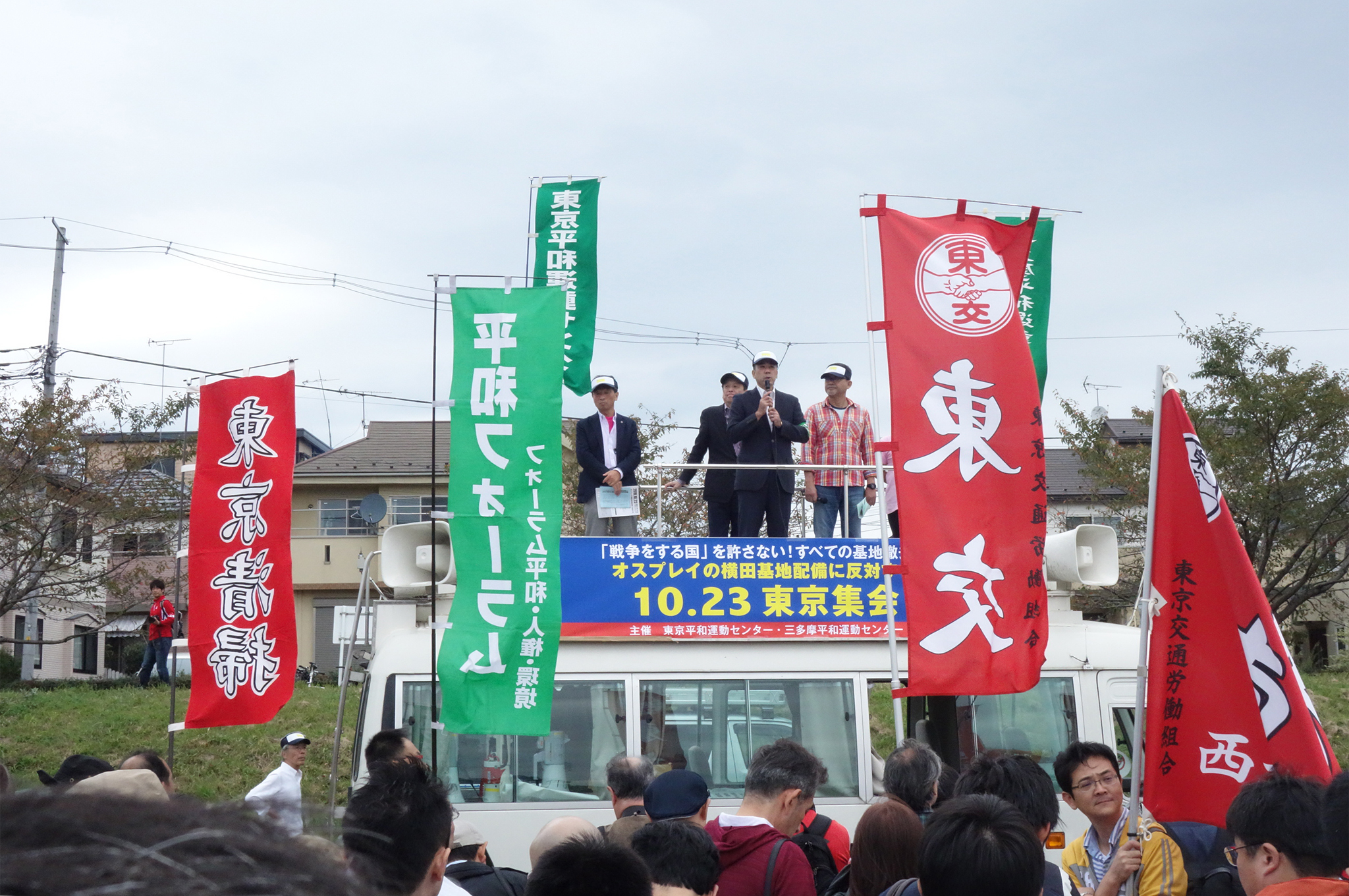 米軍横田基地に2017年からオスプレイCV―22が配備されることをうけて、10月23日午後1時30分から東京平和運動センター・三多摩平和運動センターは、多摩川中央公園で「オスプレイの横田基地配備に反対する10・23東京集会」を開催し、約2000人が結集した。この集会に東交からは125人が参加した。