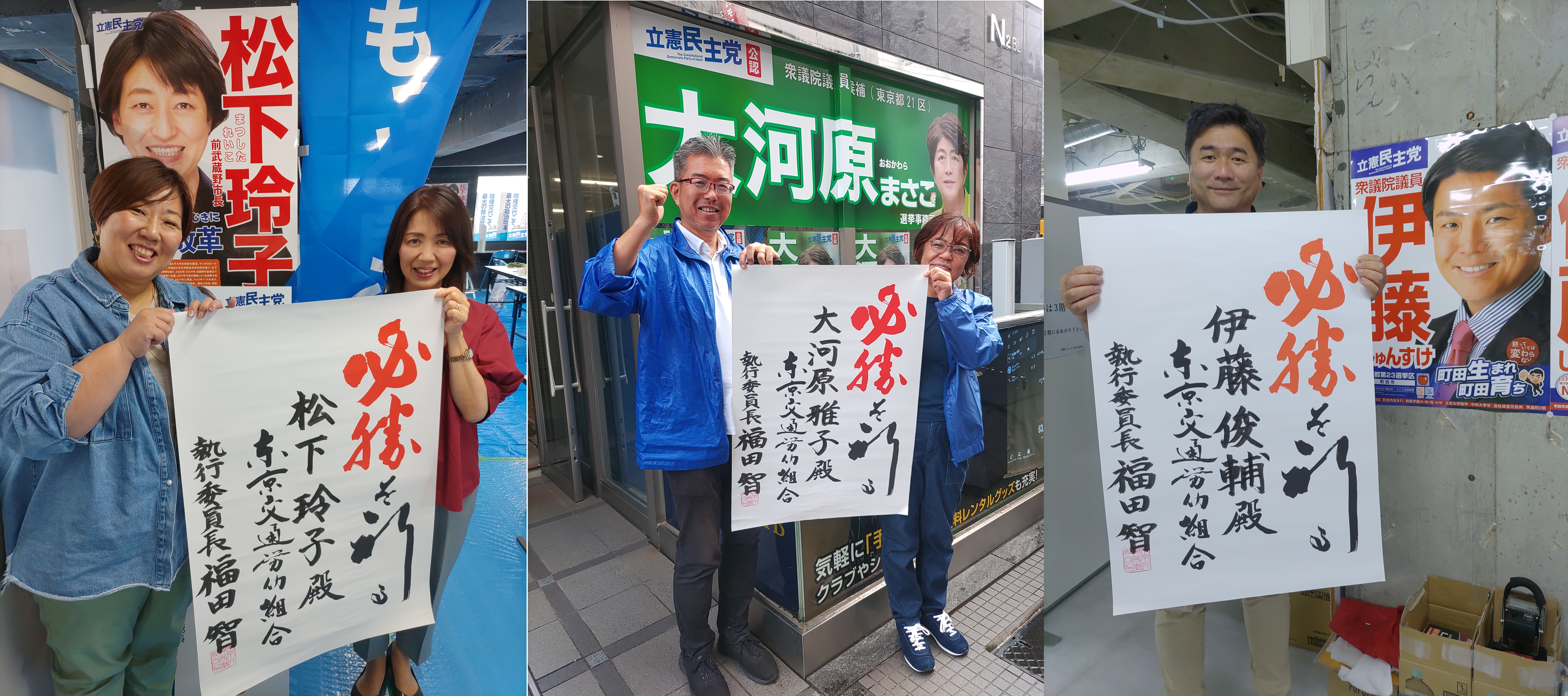 写真1枚目は、左から東京都第18区(武蔵野市・小金井市・西東京市)の松下玲子選対事務所(三鷹駅)、東京都第21区(八王子市東部・立川市・日野市)の大河原まさこ選対事務所(立川駅)、東京都第22区(町田市)の伊藤しゅんすけ選対事務所(町田駅)にて。