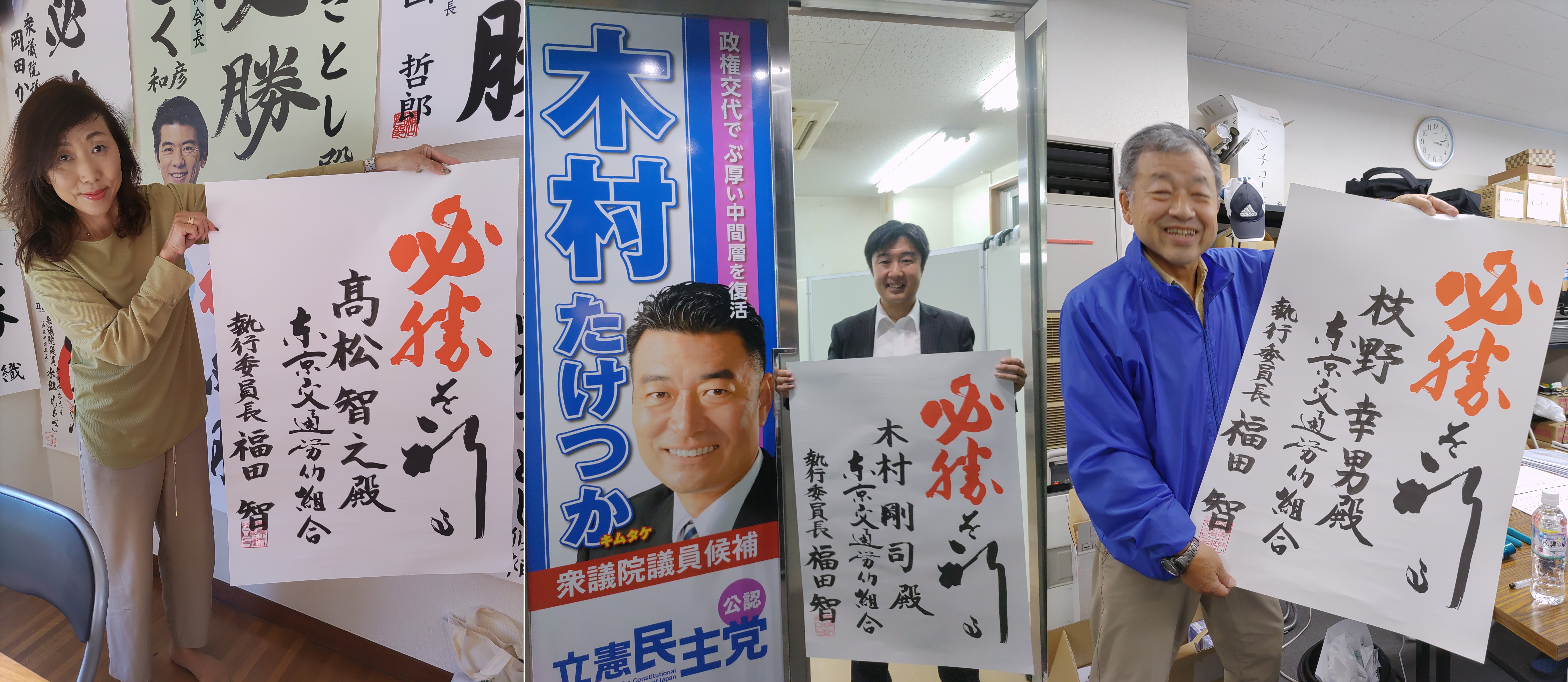 写真2枚目は、左から東京都第28区(練馬区東部)の高松さとし選対事務所(氷川台駅)、東京都第29区(荒川区・足立区西部)の木村たけつか選対事務所(町屋二丁目駅)、埼玉県第5区(さいたま市西区・北区・大宮区・中央区)の えだの幸男選対事務所(大宮駅)にて。