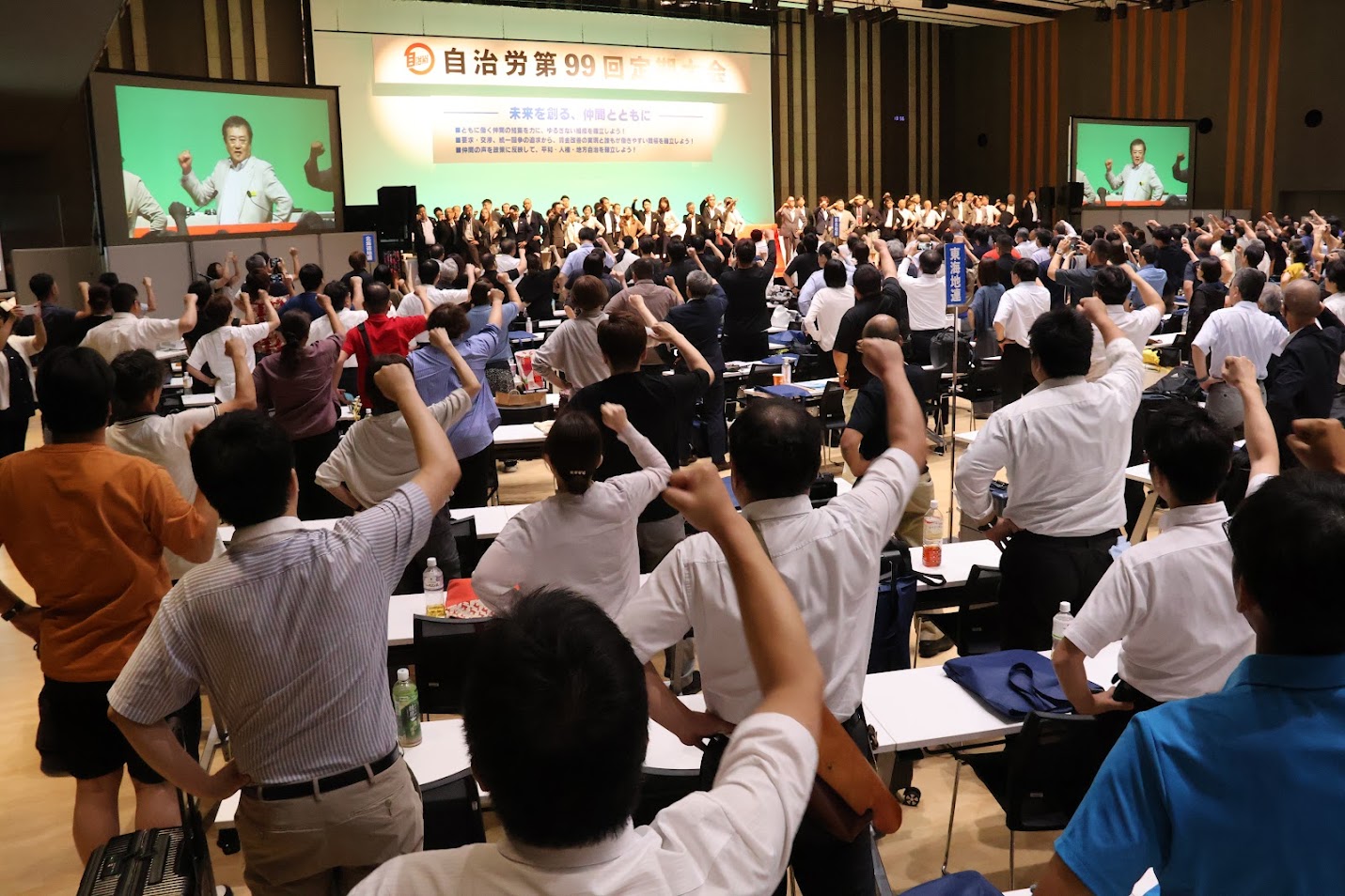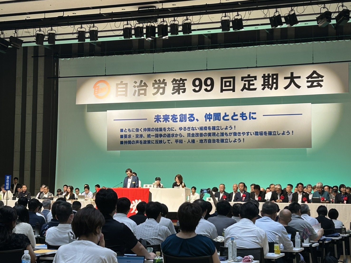 8月25日~27日、「自治労第99回定期大会」が宇都宮市で開催され、東交からは本部より、代議員及び傍聴者12名が参加した。大会では、運動方針に対する質疑にて、第4号議案について、東京都本部を代表し、松村中央執行委員長より、財政と構造改革、とりわけ組合費の引き上げに絞って、「安易な組合費の引き上げの議論ではなく、足元の組織を立て直し、組織の強化・拡大をやり抜くことだ。組織の弱体化を招きかねない組合費の引き上げの提起について県本部・単組の状況や意見の反映を行うよう求める」として、結論ありきでない議論を行うよう要請があった。