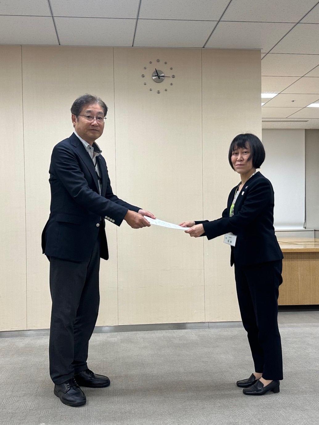 堀越交通局長(右)に要求書を手交する見城執行委員長