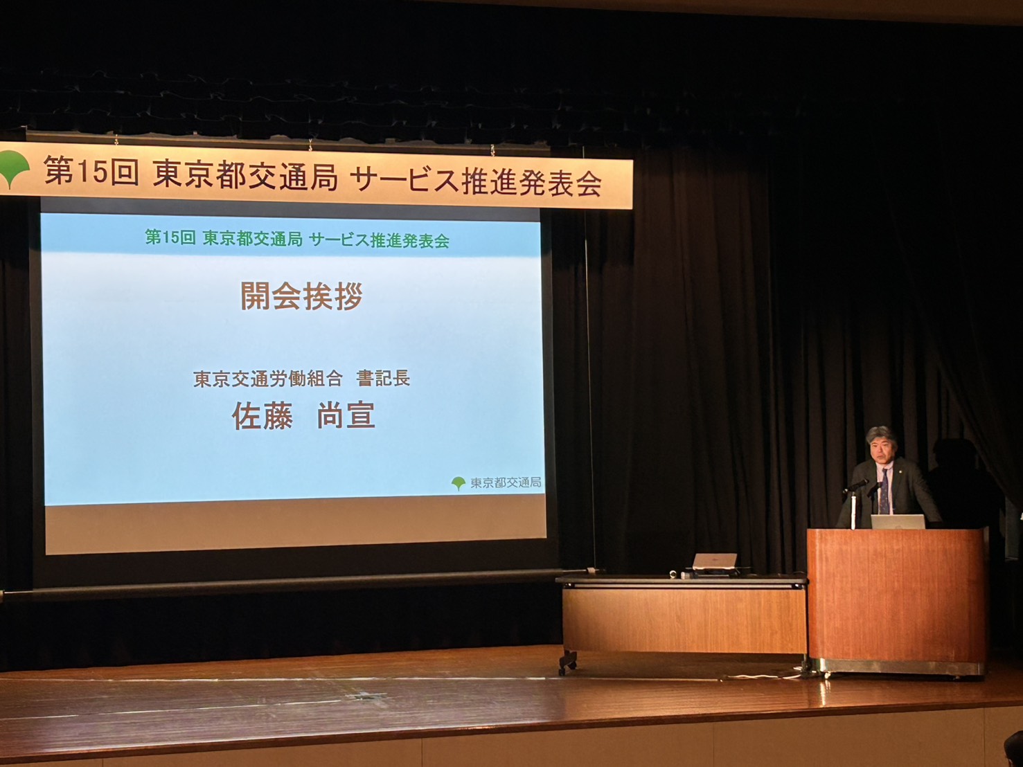 1月28日、東京都交通局サービス推進発表会が行われ、午前の部は見城執行委員長、横山次長が挨拶を行った。