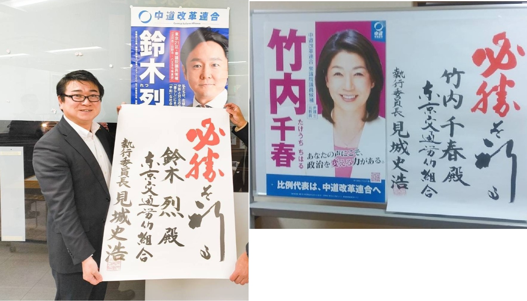 写真1枚目は、左から東京都第21区(八王子市東部・立川市・日野市)の「鈴木烈」選対事務所、埼玉県第3区(越谷市・川口市の一部)の「竹内千春」選対事務所にて。
