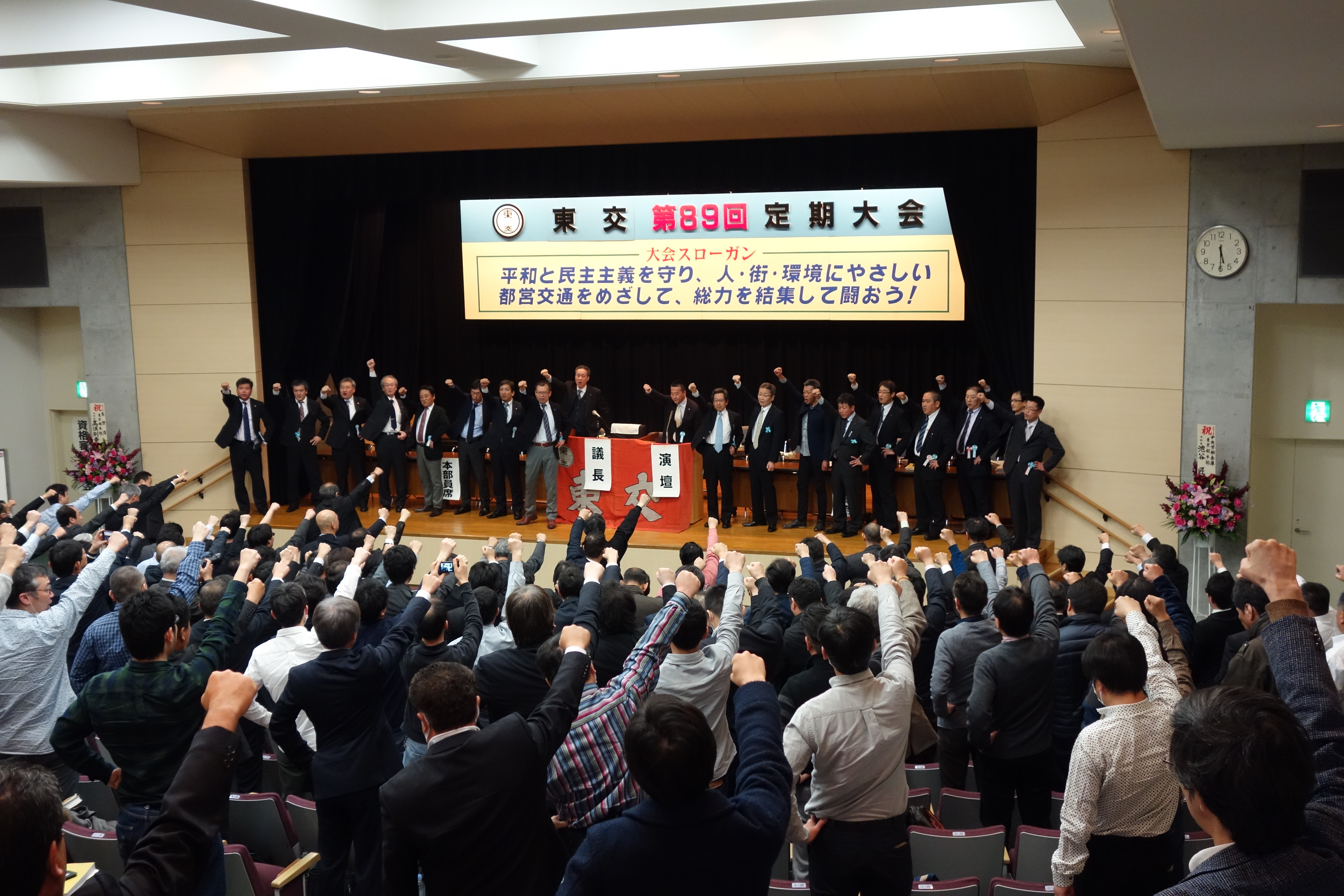 東交第89回定期大会は3月14日、田町交通ビル6階ホールで代議員170人をはじめ来賓など、約260人の関係者が出席して開かれた。大会は、「賃金闘争の強化、地方公務員給与と人事制度の改善、『経営計画2016』の取り組み、欠員補充・要員確保の闘い、組織強化の取り組み、反戦・反核・平和運動の強化、都議選勝利」などを柱とする2017年度の運動方針を決定した。