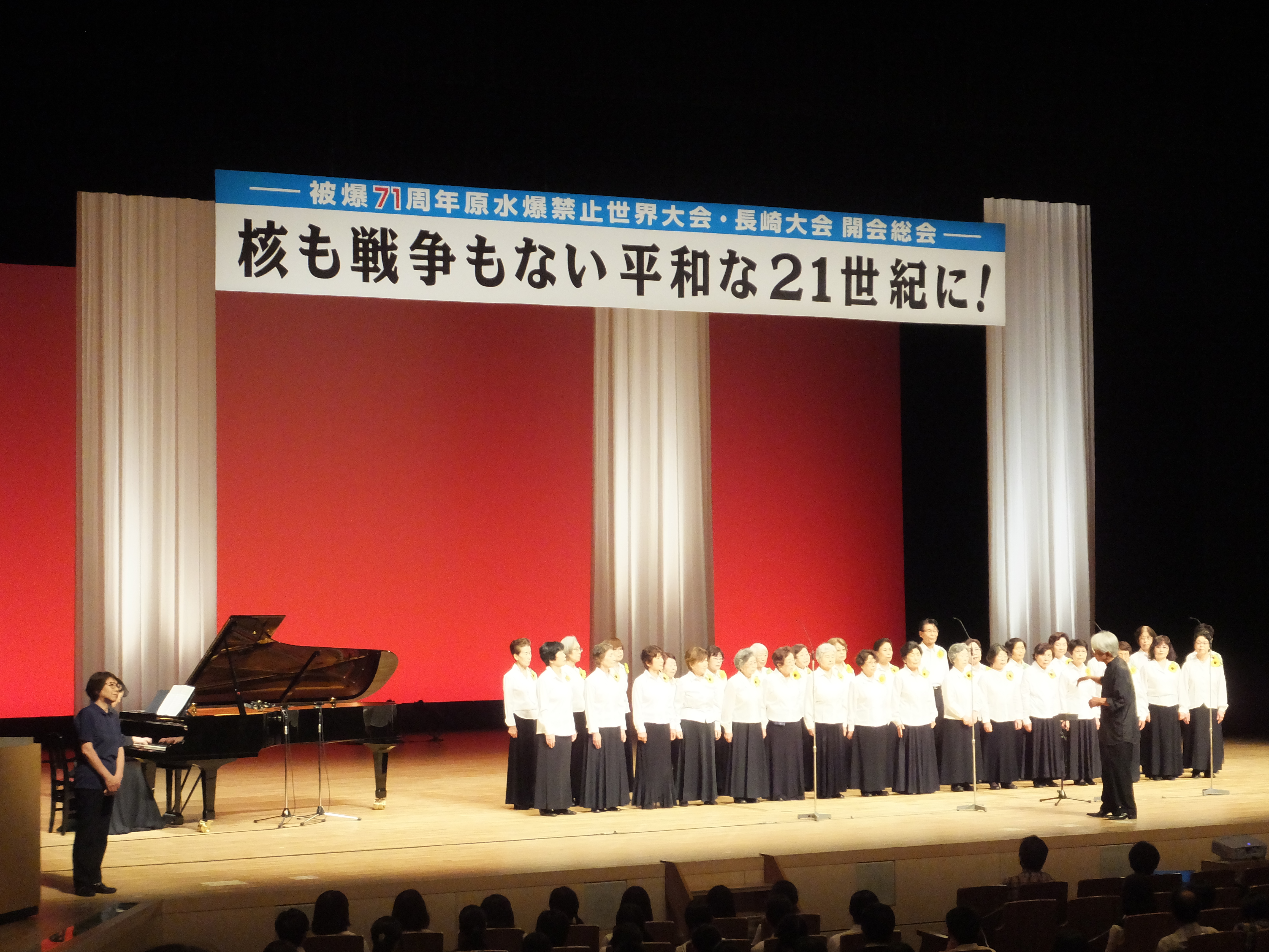 原水爆禁止長崎大会は、約1800人の参加のもと、被爆者歌う会「ひまわり」の合唱で始まりました。この会は亡くなった方々の「声無き声を歌い続ける」ため、毎週火曜日の練習を欠かさず続けており、「生き残った者として歌い続ける」との言葉は、71年経った今でも原爆の傷跡は消えていないと思い知らされました。