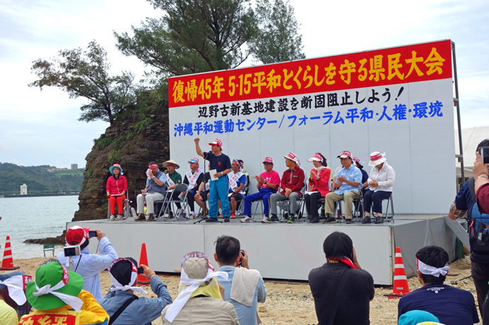 午前10時から名護市・大浦湾瀬嵩(せだけ)海岸で行われた「復帰45年5・15平和とくらしを守る県民大会」に参加した。県民大会には、沖縄県民をはじめ、全国の代表者など約2200人が集結し、山城博治実行委員長の力強いあいさつをはじめ、激励・連帯の挨拶のあと、大会宣言では、「日米両政府によって推し進められる米軍、自衛隊基地の強化、拡大に強く反対することを表明する。さらに続発する米軍関係者による凶悪犯罪を糾弾し、日米地位協定の抜本的改正を強く要求する」と、満場の拍手で確認した。