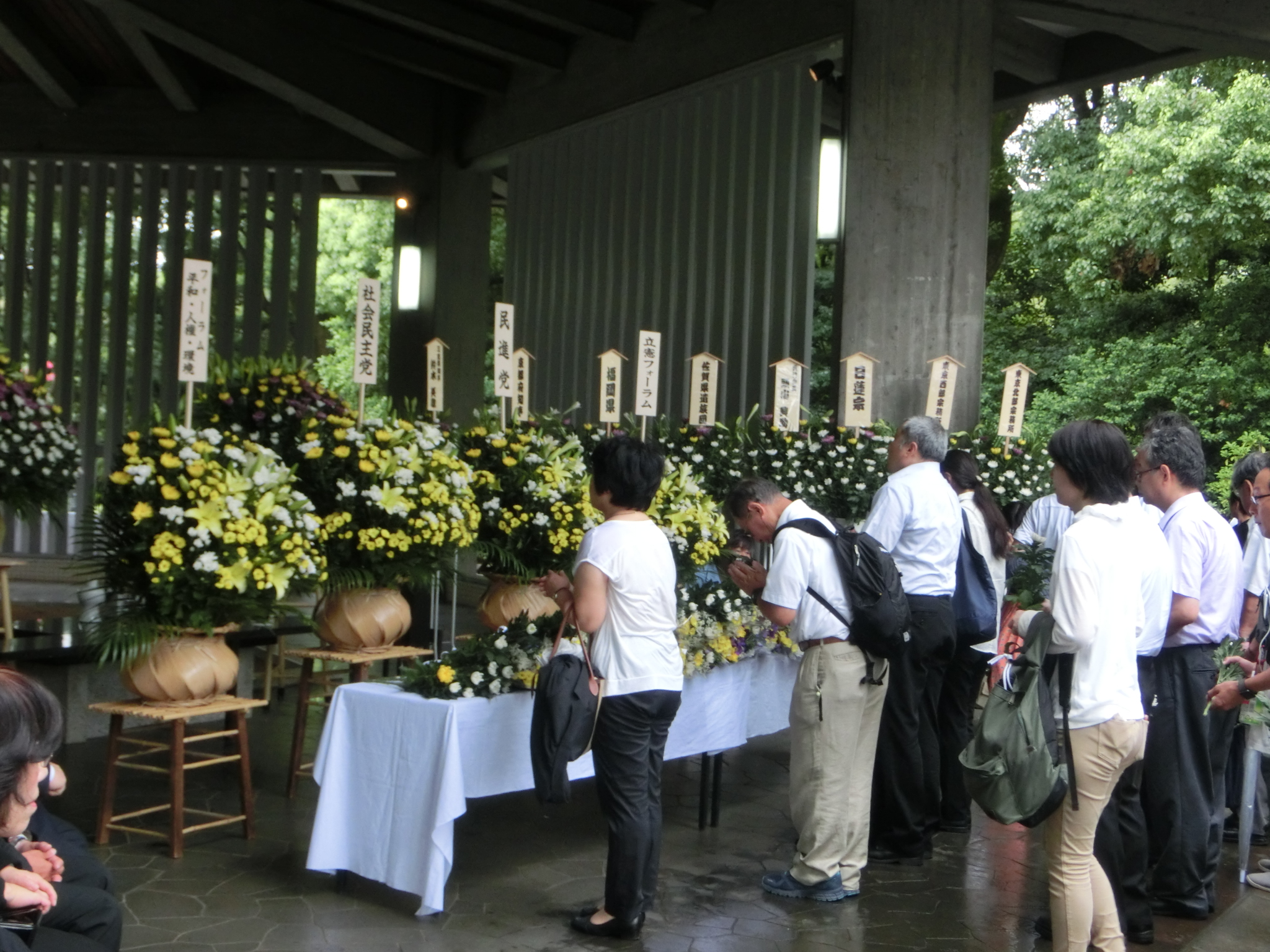 続いて、民進党、社民党、戦争をさせない1000人委員会、立憲フォーラムの代表者から、それぞれ平和への誓いと闘う決意が述べられたあと、主催者、各団体代表、各労働団体代表の献花、さらに参加者一人ひとりが献花を行い、戦争犠牲者に対する冥福を祈って、非戦の誓いを新たにした。