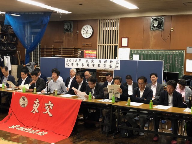 10月26日午後6時30分より江東支部・道場において、東部地区教宣集会が組合員77人の参加で行われた。